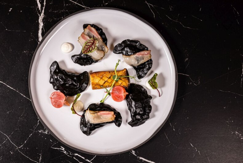 Oscypek cheese sauce / saffron milk cap mushrooms / spinach / ricotta / chive oil
