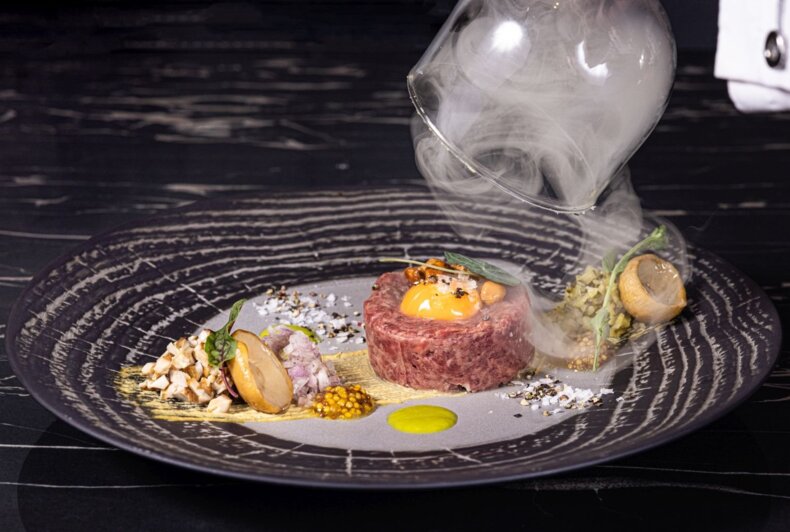Smoked beef tartare/ shallot/ boletus/ cucumber/ yolk