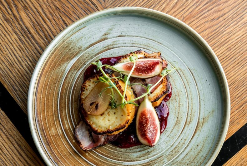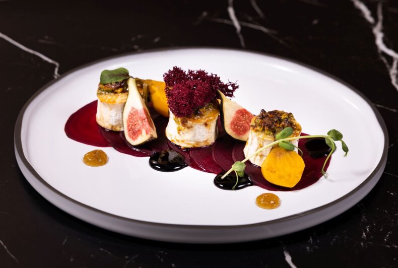 Baked goat cheese with honey and pistachios/ beetroot/ fig/ balsamico
