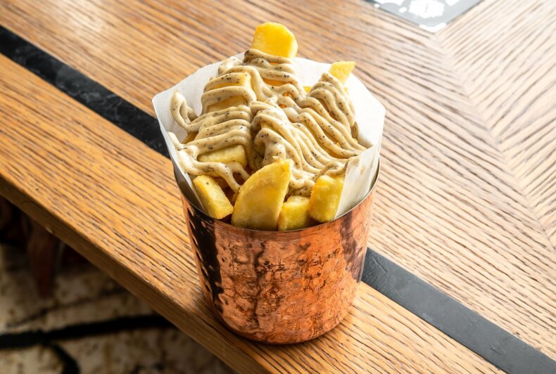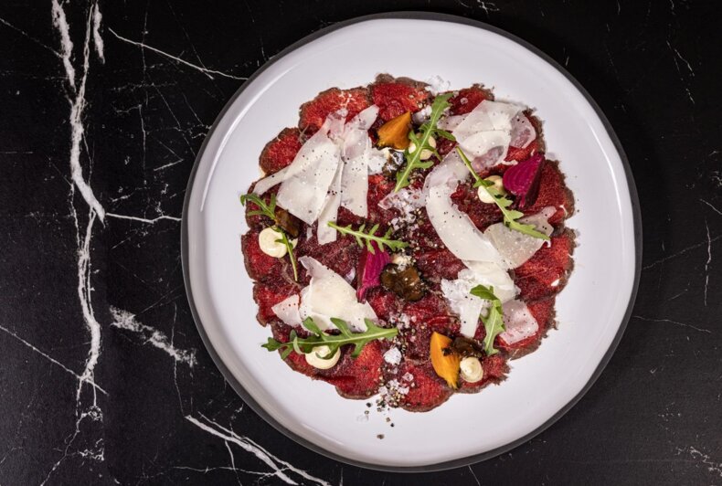 Seasoned deer carpaccio/ arugula/ grana padano/ truffle mayonnaise/ pickled beetroot