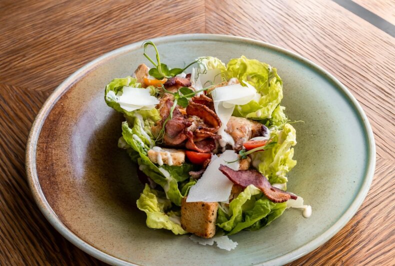 Lettuce with chicken/ anchovies/ bacon/ Parmesan/ toast/ Caesar sauce