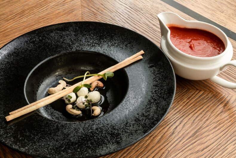 Tomato cream/ coriander oil/ cashews/ grissini
