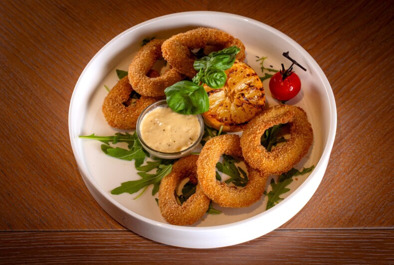 Smażone krewetki, kalmary, ośmiorniczki, sos aioli, focaccia